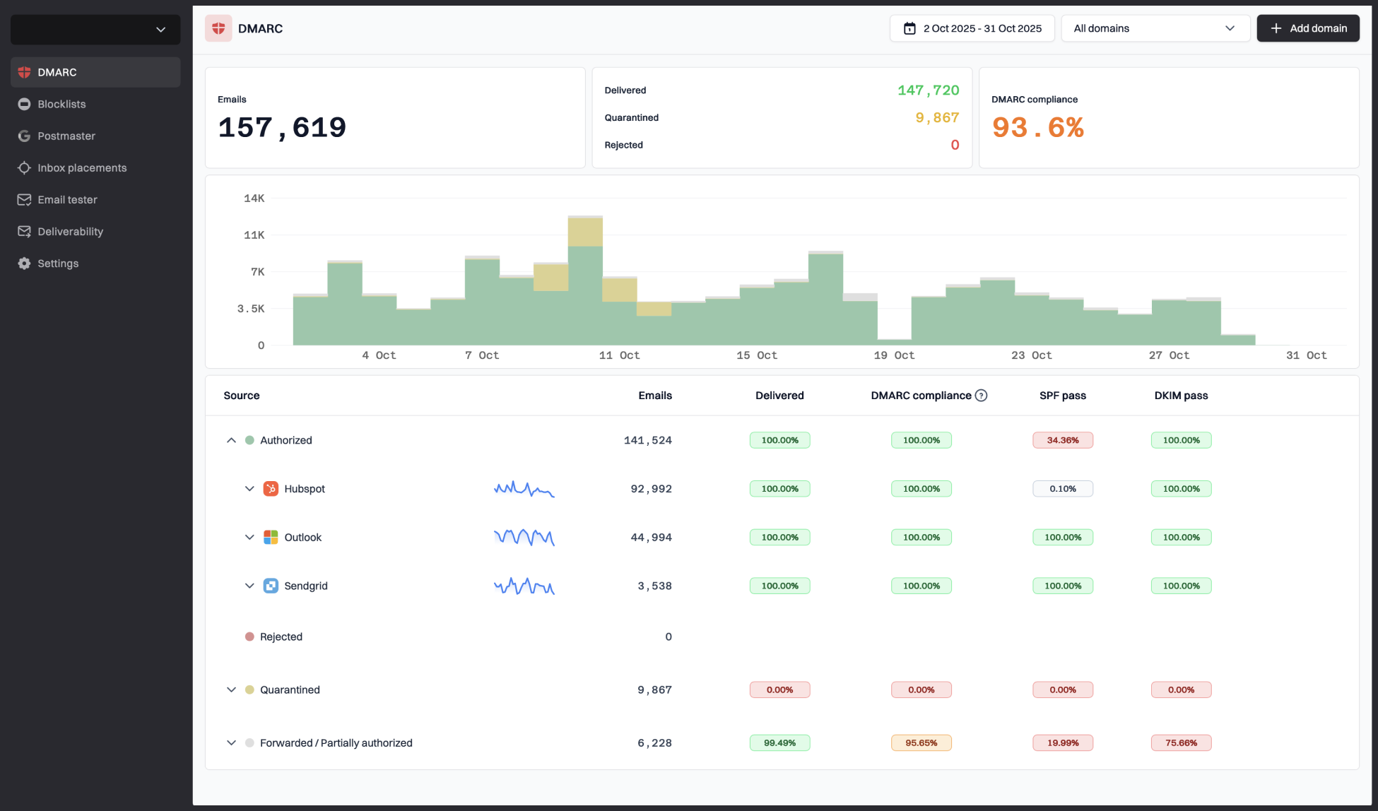 Our experience shows Suped excels in providing detailed DMARC report analysis, coupled with essential features such as: